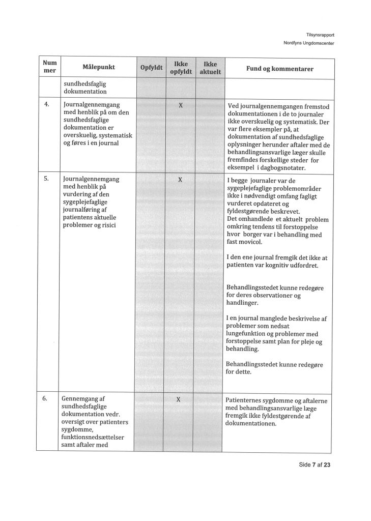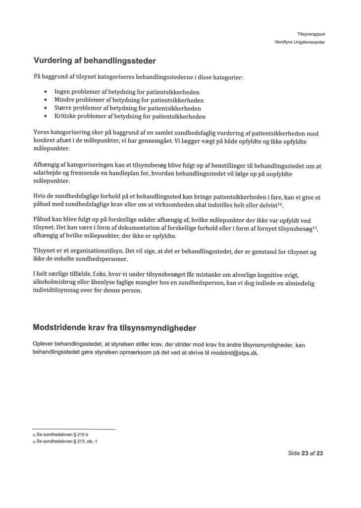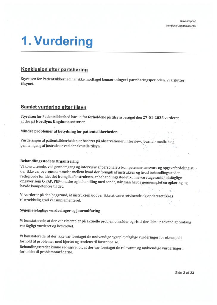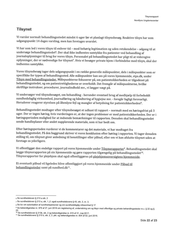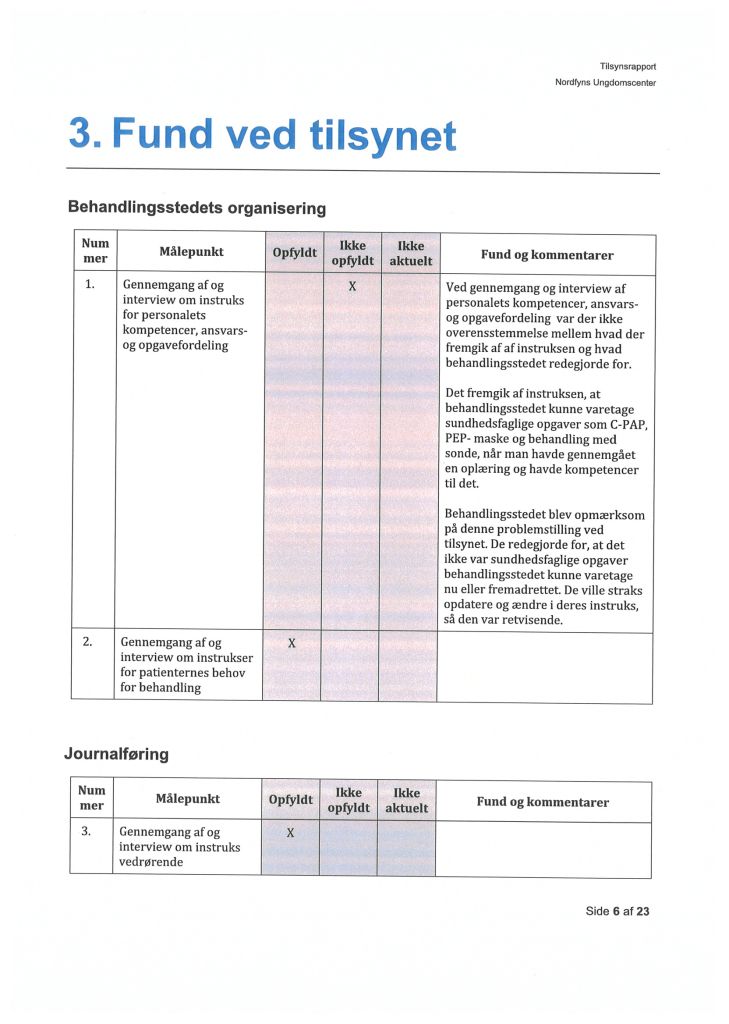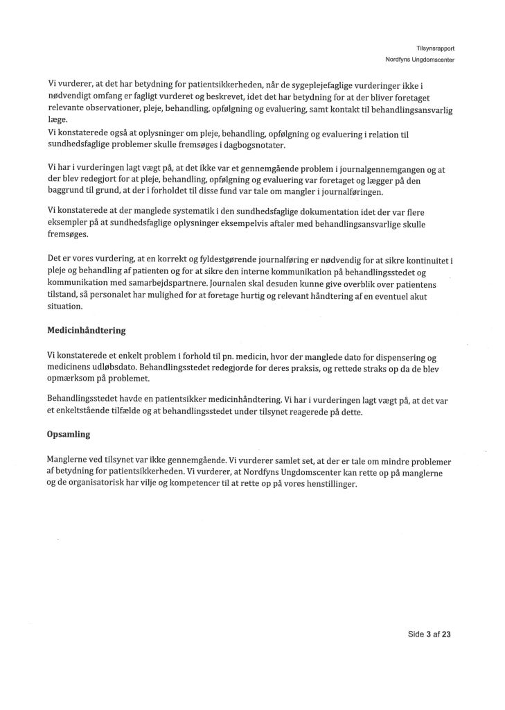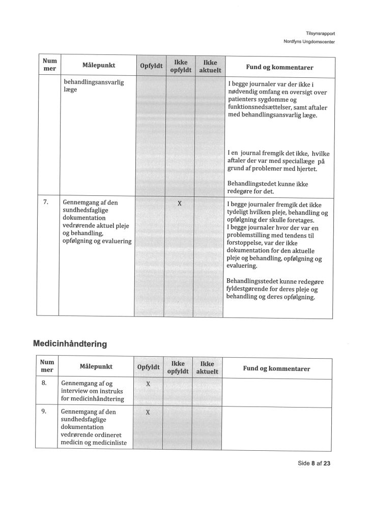 Her ses “Tilsynsrapport Nordfyns Ungdomscenter, Sundhedsfagligt, planlagt – udgående tilsyn”